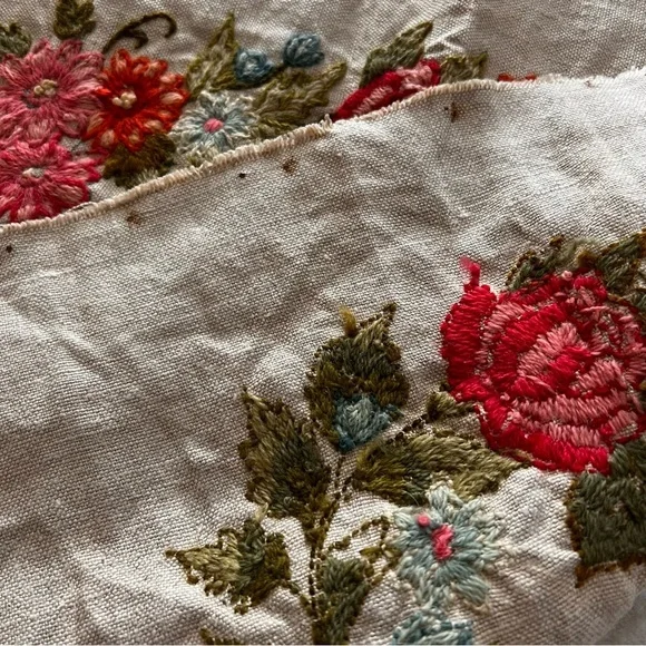 20”x16” Antique French Embroidery Panel, Flowers,Frame or Pillow.A beautiful panel of 19th century embroidery, needlepoint and other stitches wool yarns, it was likely taken from a frame. It wasbuying antiques in France.I have some idea it was in a shaped frame, perhaps under glass.Deserves to be stretched and framed as the beautiful devotional it truly is. Birda and florals in that arched wreath border are beautifully done. The Flowers areelegantly worked on a linen fabric rather than a broader weave needlework canvas. Stitches are tine and yarns are undamaged. Very good to excellent condition for age and type. It seems strong enough to me to be worked as a pillow top, more for display than for lots of wear, though. I think best use would be to have it framed (again), it's so lovely. No troublesome holes or tears.