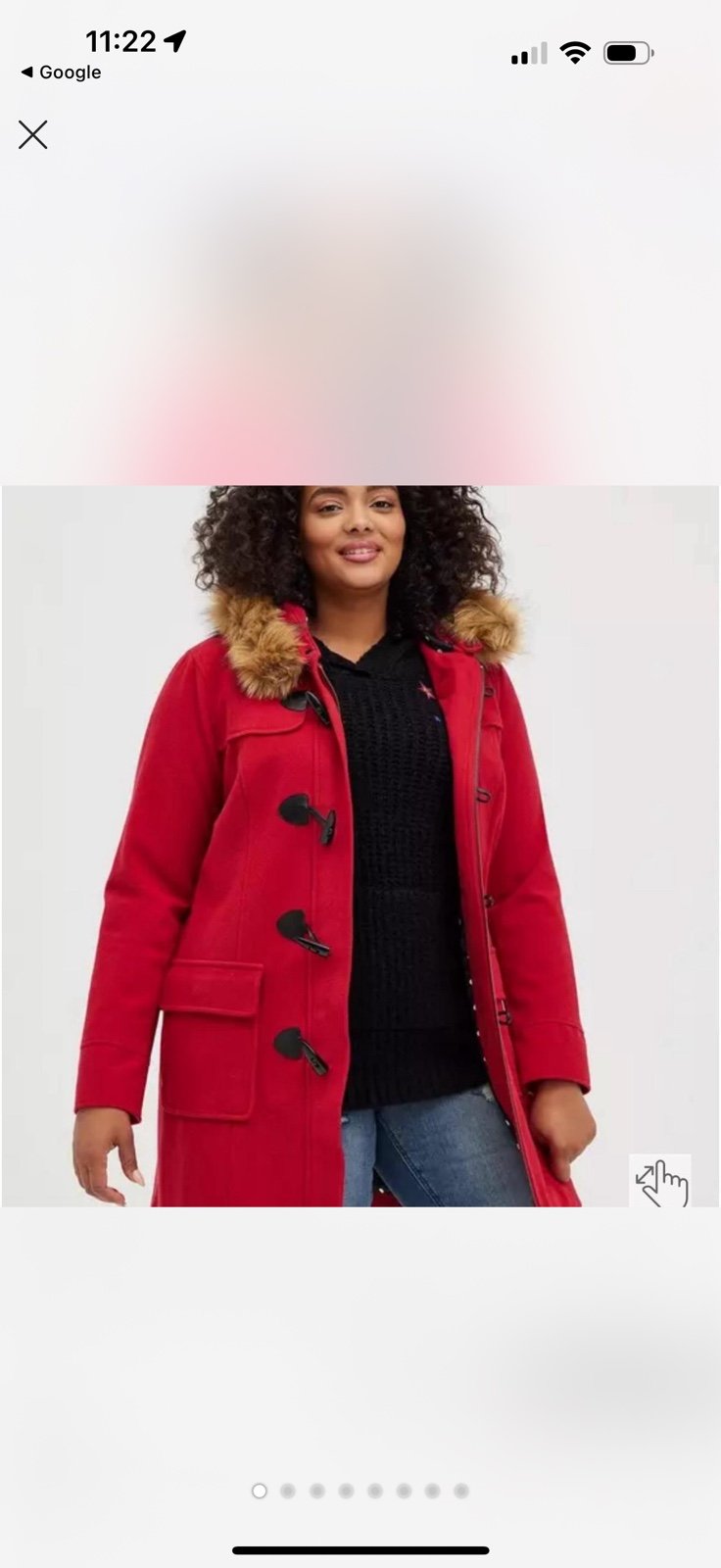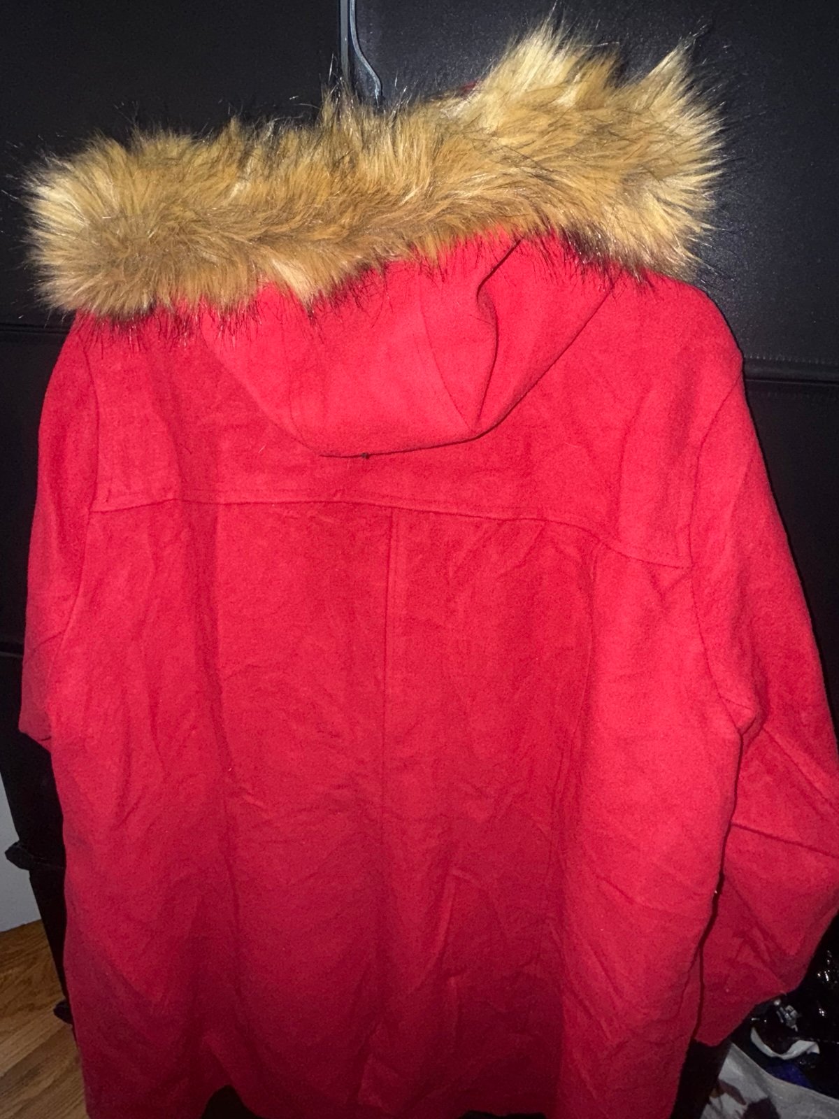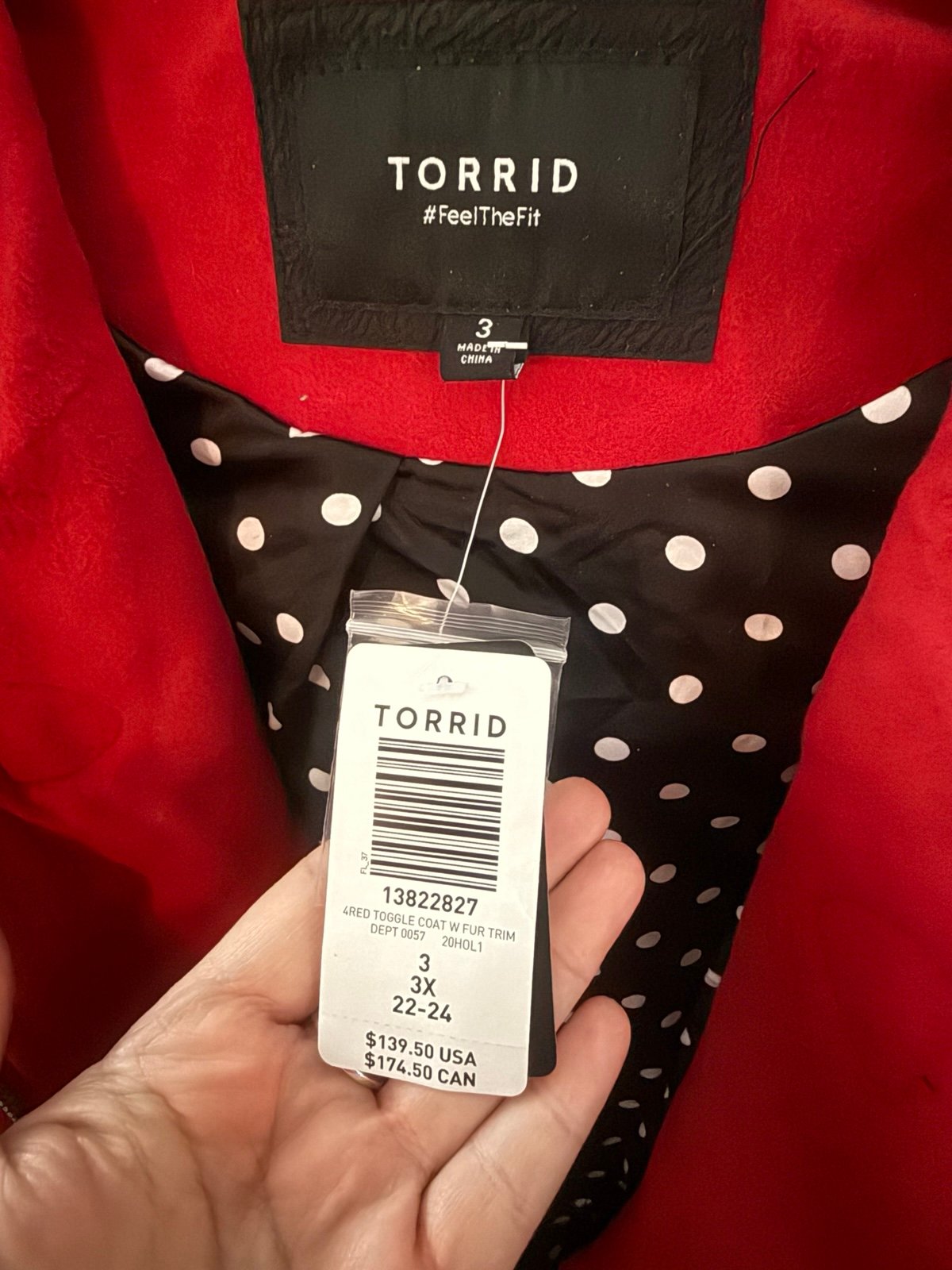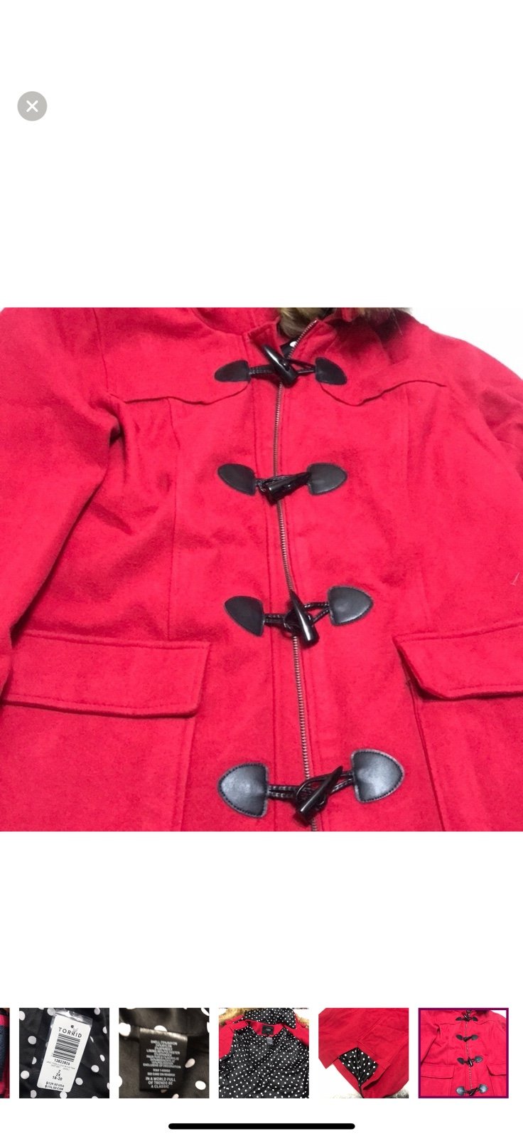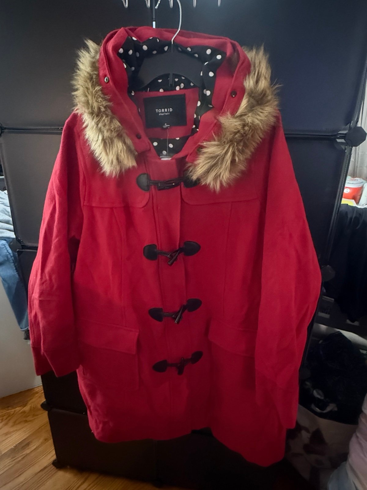 Very cute and stylish Torrid coat with toggle closures and zipper underneath. Very nice coat with removable faux fur hood. Brushed ponte fabric. Cute polka dot lining. Front pockets. Machine washable. Make an offer or bundle with some of my other items! Retail $139.50. New with tags attached.