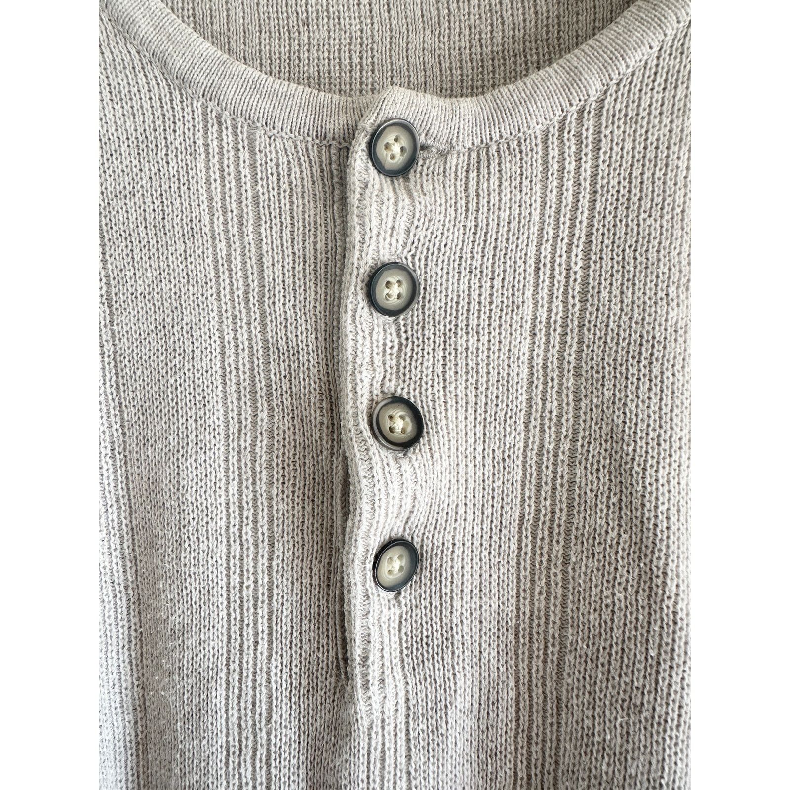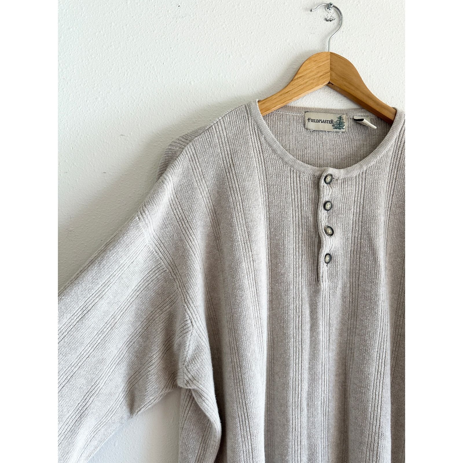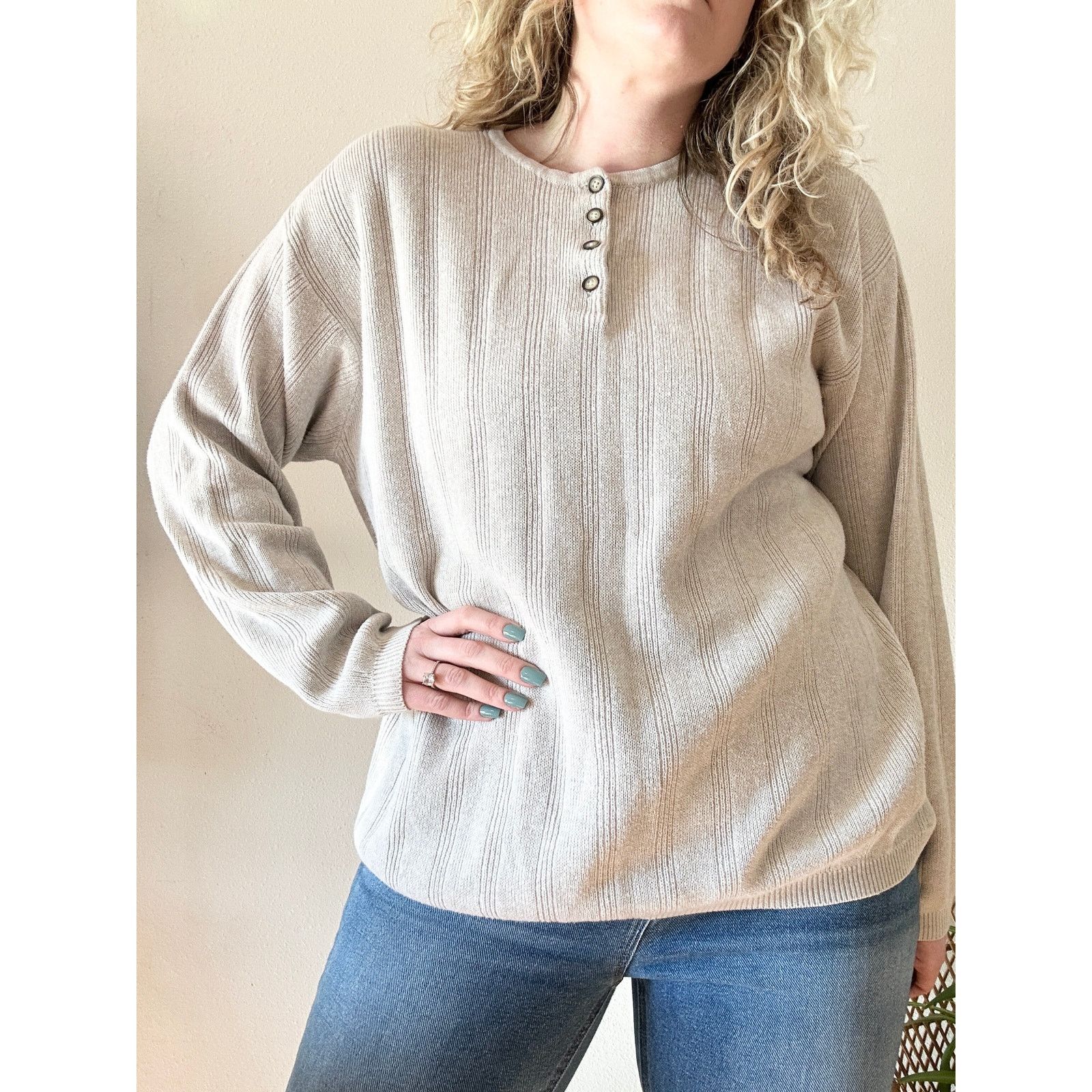 Great quality, cozy sweater with a fun button neckline and striped knit pattern. This is 100% cotton but a lighter weight knit and super comfy.