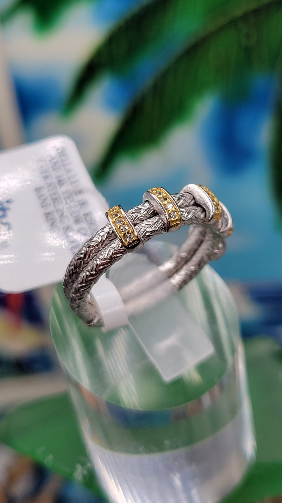Bella Luce (R) 0.23ctw White Diamond simulant, 14K Yellow Gold accents, Rhodium over .925 Sterling Silver "double-band" ring. Measures app 0.88"long x 0.19"wide. Not sizeable. Size 7