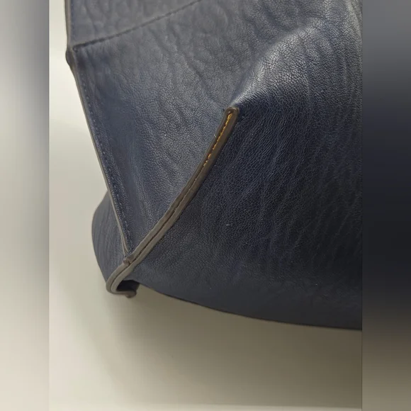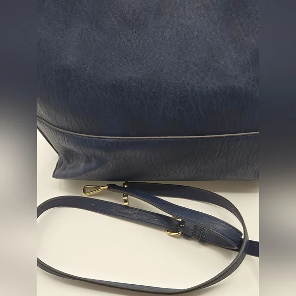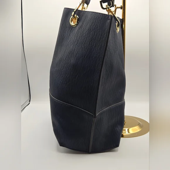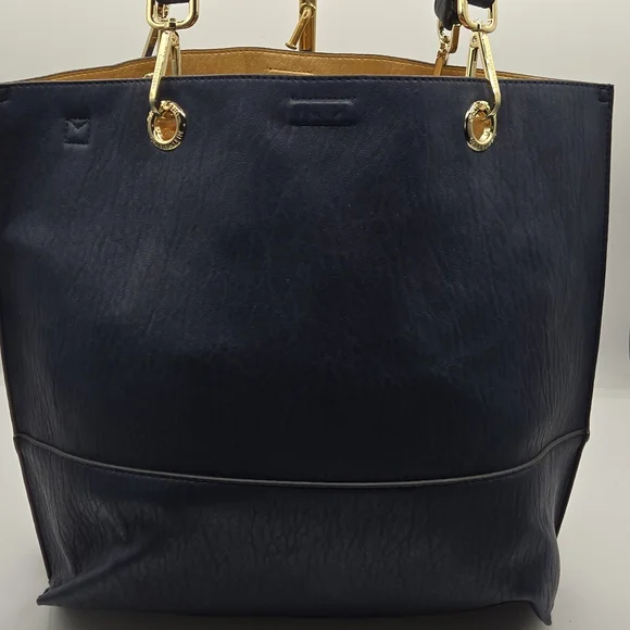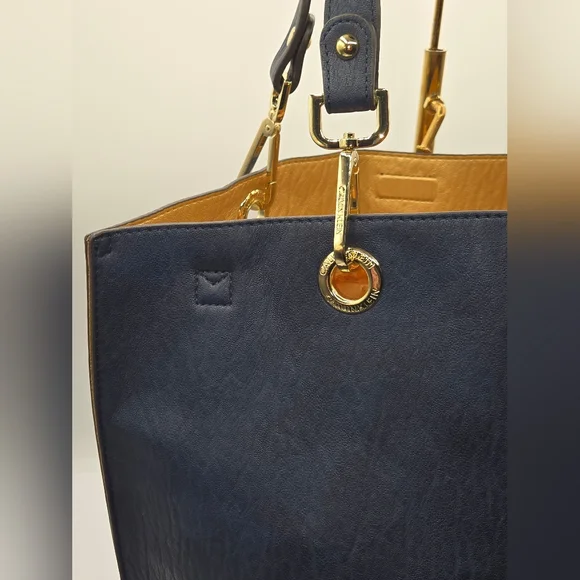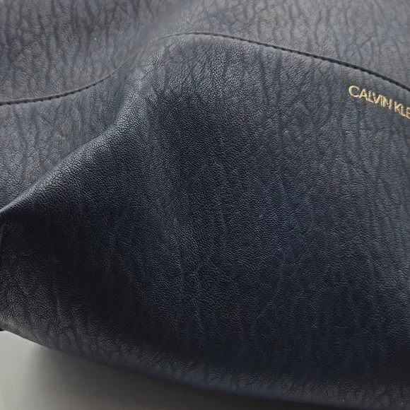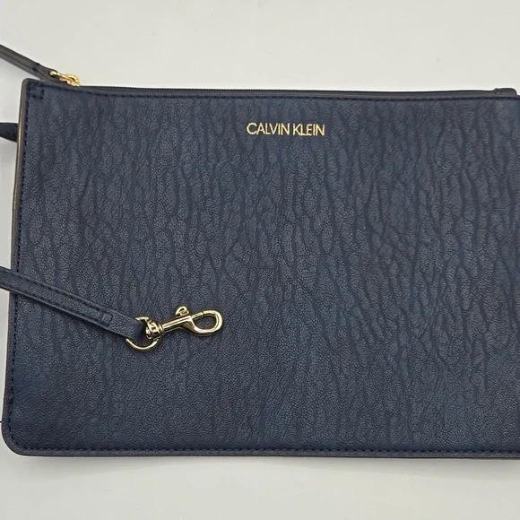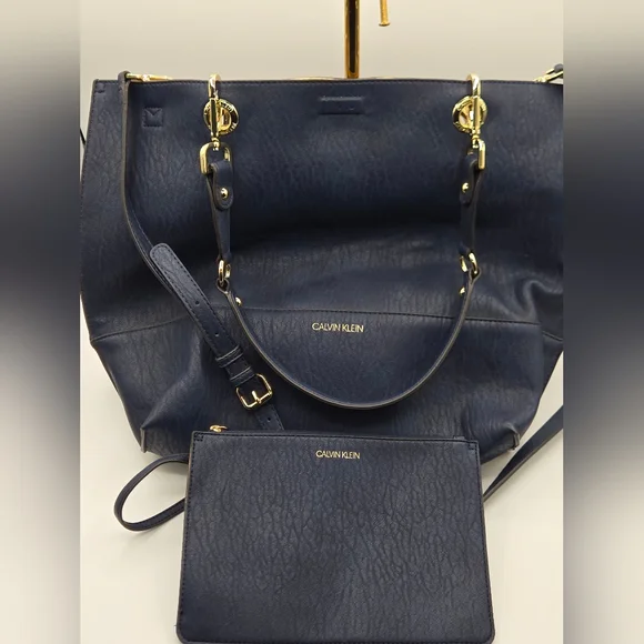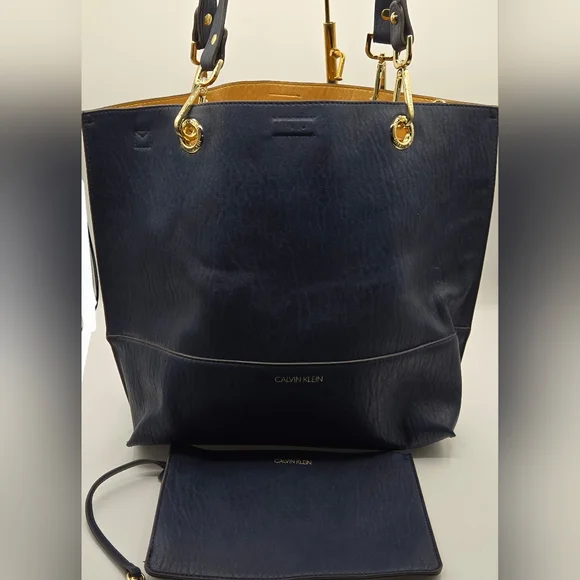 CALVIN KLEIN Tote w/ Wristlet Soft Navy Vegan Leather, Gold DetailDust bag included Detachable Crossbody StrapGold hardwareGold interiorbag measures approximately:17"w x 15"l x 7"dstrap measures approximately:shoulder strap drop - 12"Crossbody strap (detachable) - 26" and adjustableExcellent condition,no call outsAll items are shipped promptly and handled with care bundle and save