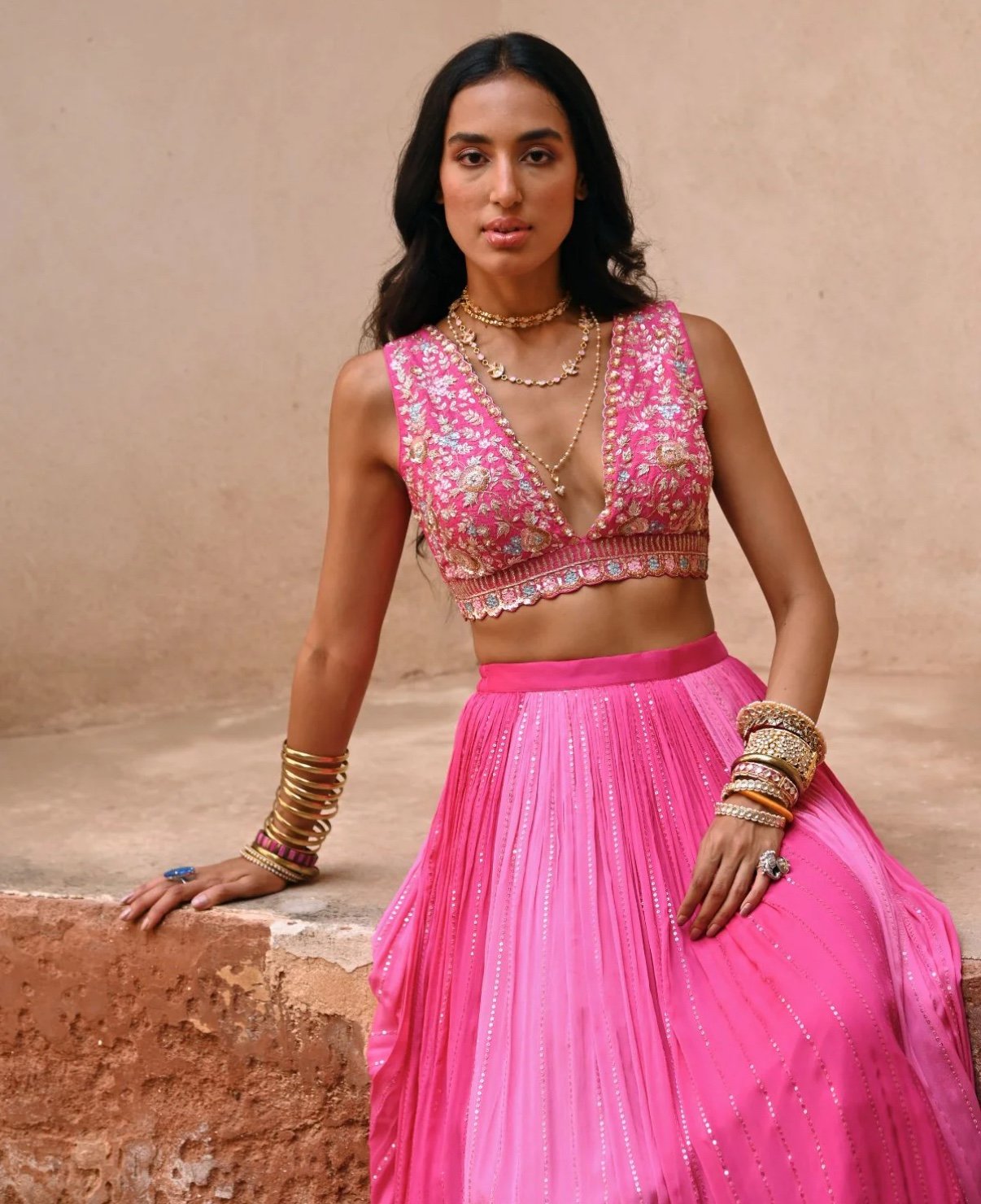 This exquisite Ombré meadow lehenga set features an intricately embroidered blouse adorned with resham zardozi and glassbeads. The shaded georgette skirt and tulle dupatta complete this stunning ensemble, making it perfect for any special occasion. Turn heads with this unique and beautiful piece.