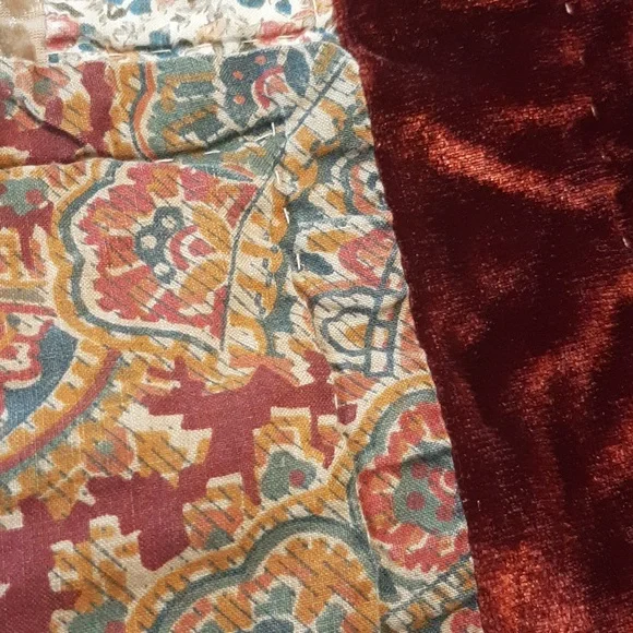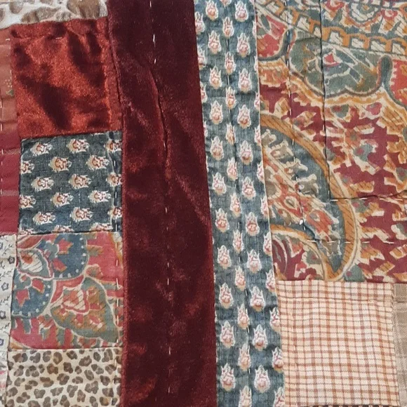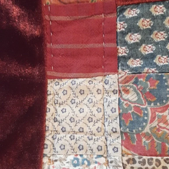 60 x 60in Patchwork quilt has a beautiful medley of color and old world style. Burgundy red in velvet enhances the otherwise variety of colors and prints in this quilt give it an elegance that can be perfect throw for any bedroom,or living area. **Burgundy red is much deeper than in photosConstructed with a 2.5 rod pocket to hang aswall art. Beautiful and versatile. NOTE:Excellent pre owned condition , however may have a hand stitch or two missing or loose, not affecting construction or usabilty.625AT
