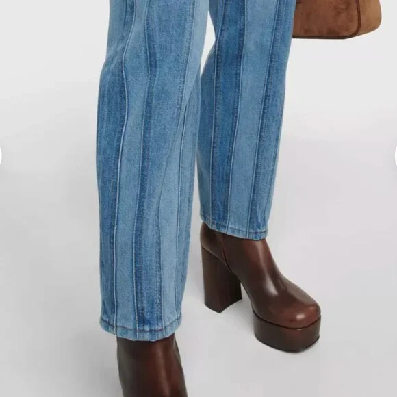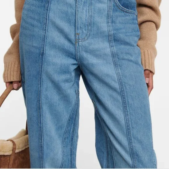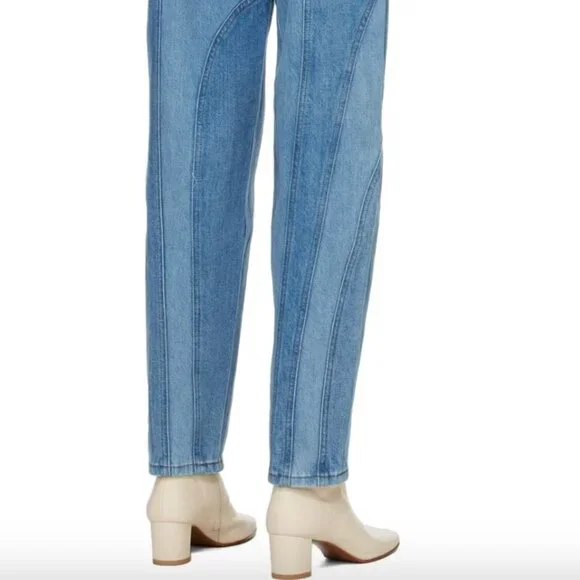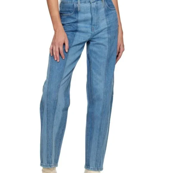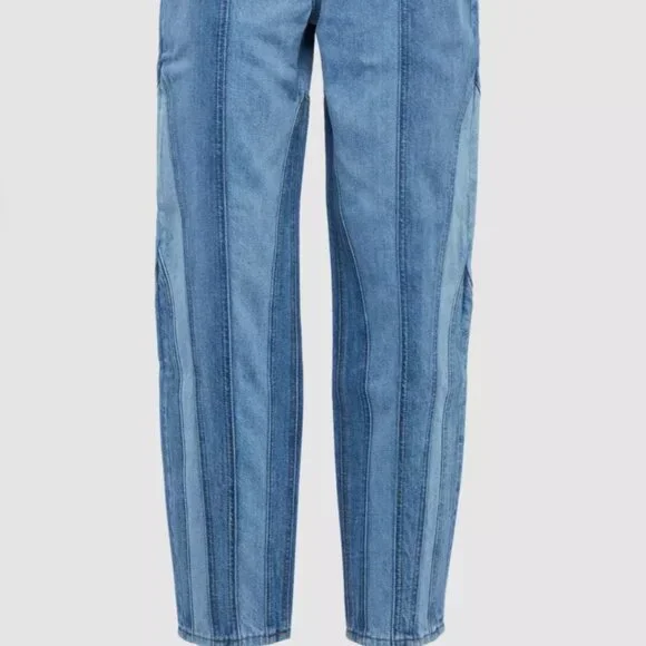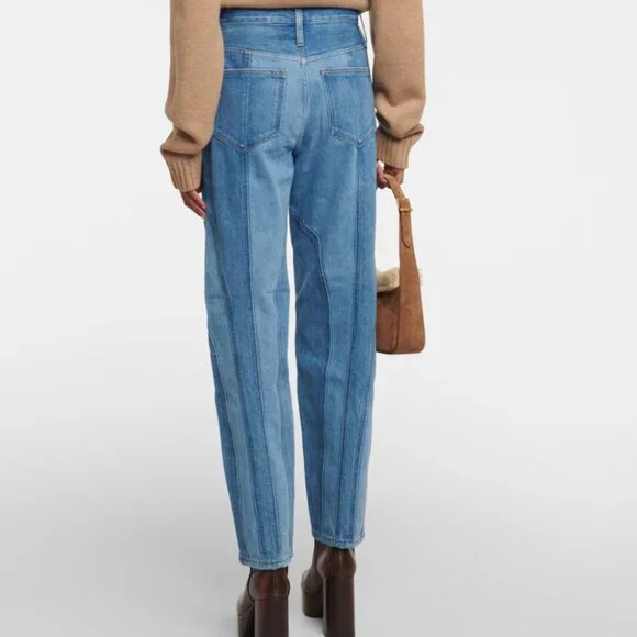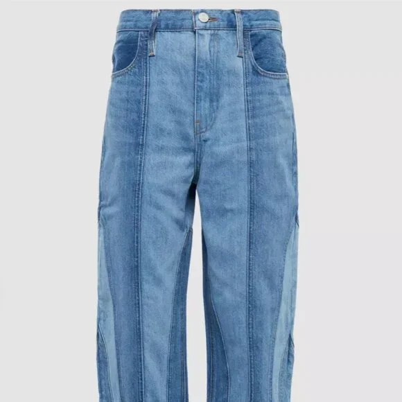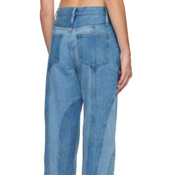 Frame Warped Stripe Barrel JeansColor: "Indigo Curves"Size 31Brand new with tag. Retail $498The Warped Stripe Barrel jeans from Frame are made from pure denim cotton into a high-rise silhouette. They’re defined by striped patchwork denim and curved seams which create barrel-shaped legs.Belt loopsCurved seamsZipper fly, button fasteningSide slit pockets, back pockets 100% cotton