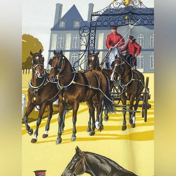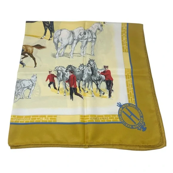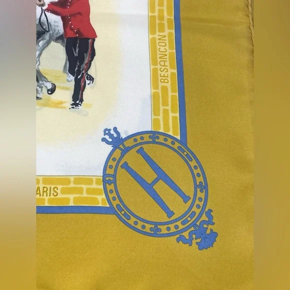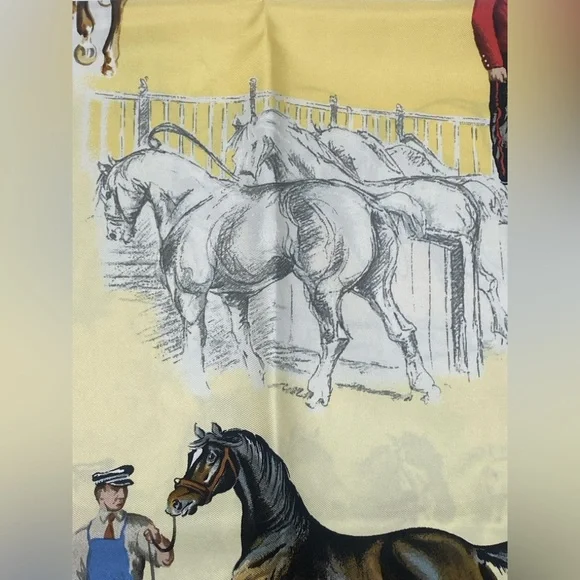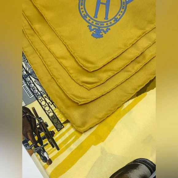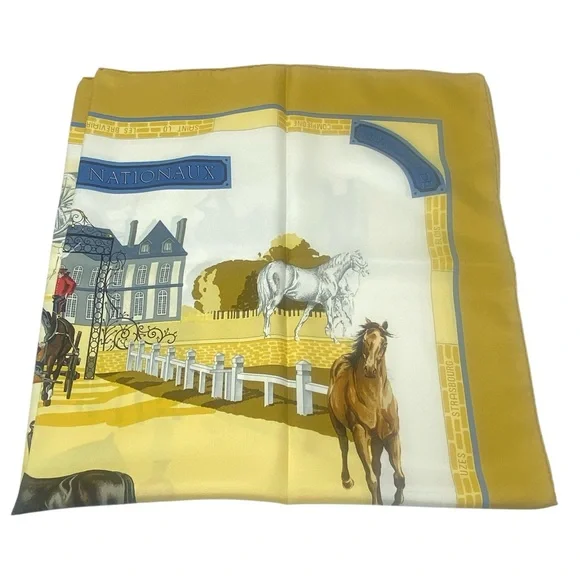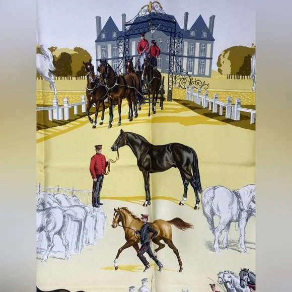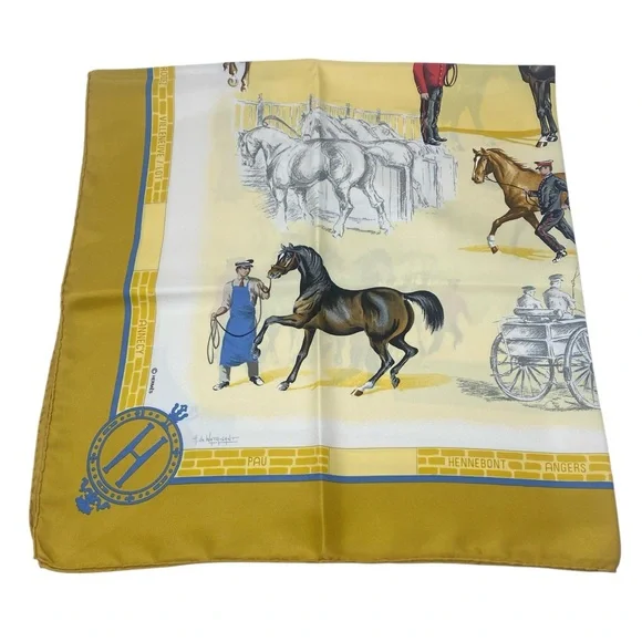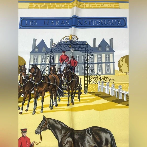Beautiful Vintage Hermès "Les Haras Nationaux" silk scarf, designed by Hubert de Watrigant and first issued in 1989. The scarf depicts scenes from the Haras Nationaux, a French public agency regulating horse breeding. The design includes various horses, carriages, and figures in a stable or training setting, surrounded by a border with the text "HERMÈS PARIS". The scarf is predominantly gold and white with blue and brown accents. This particular design is a collectible item, reflecting Hermès' heritage in equestrian-themed luxury goods.Please see all the photosScarf is in very good conditionThis is an authentic vintage Hermès silk scarf, a true collector’s piece that embodies the luxury and craftsmanship of the brand. Made from the finest silk, it features an intricate design with vibrant colors that remain stunning over time.As a vintage item, this scarf may show signs of previous use, such as slight wear, minor pulls, or faint marks, consistent with its age. Please review all photos carefully before purchasing, as this is a pre-loved item with history and character.Only purchase if you appreciate the uniqueness of vintage pieces and understand that it may not be in pristine, brand-new condition. If you have any questions, feel free to ask!