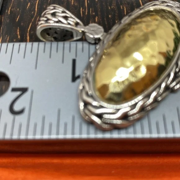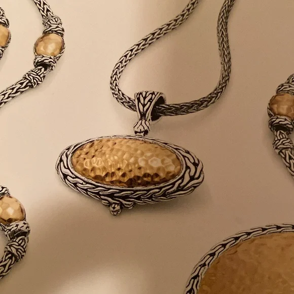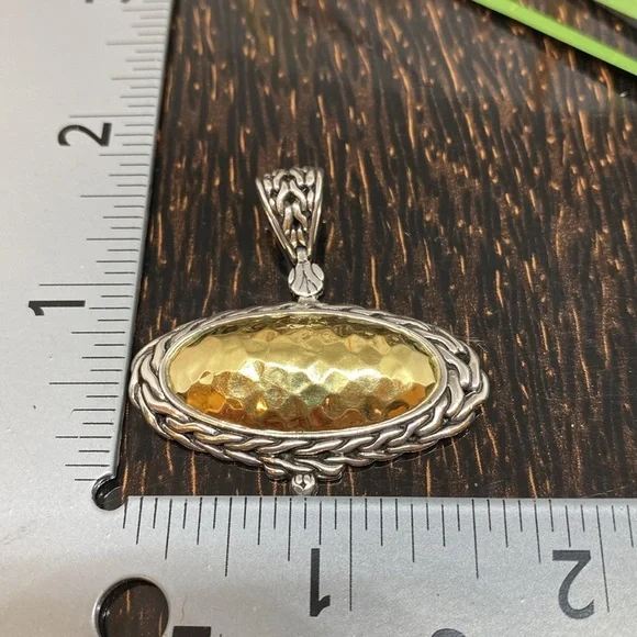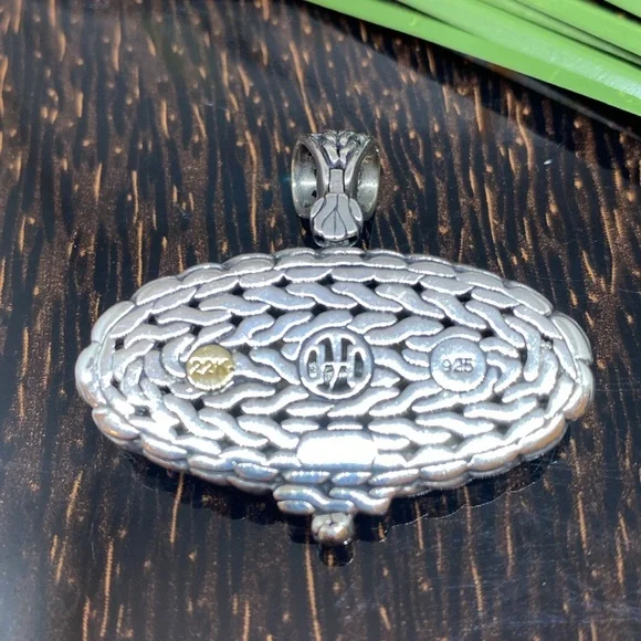 Stunning John Hardy Palu Silver Classic Chain and Hammered 22K Gold East West Pendant. Hallmarked 22K, 925 and John Hardy. Large bale does not open but can accommodate most John Hardy wide chains. The last photo is from an original catalog. Excellent preowned condition. I currently have many John Hardy Classic Chain necklaces in my closet that would look stunning with it.