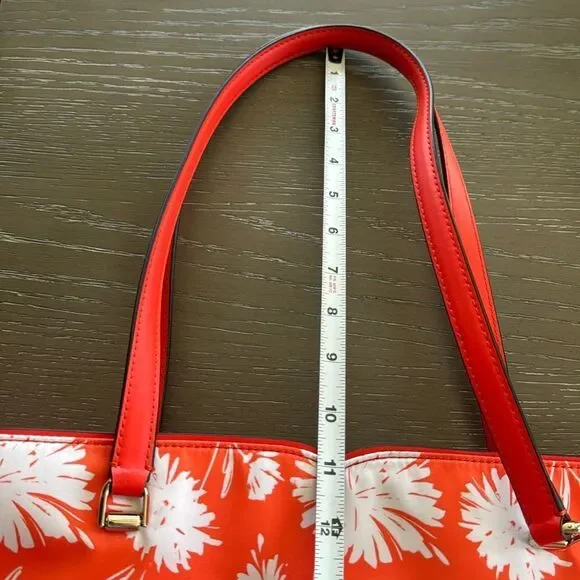 Kate Spade Jae Blossom Large Tote Polyester Leather Floral Orange White Weekender Bag Casual EUCStylish tote bag with a floral design. Perfect for everyday use, weekend, beach, travelExcellent pre-owned condition, clean, no flaws!Smoke free. 13”W 12”H x 5.1"D Handle drop: 11” Material: Polyester, nylon trim: Smooth leatherColor: Orange, white, gold-tone hardware Beveled spade logoInterior 2 slip pockets, 1 zip pocket Top zip closure, 1 front zip pocket and one side zip pocket