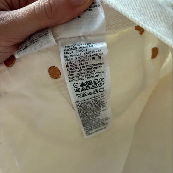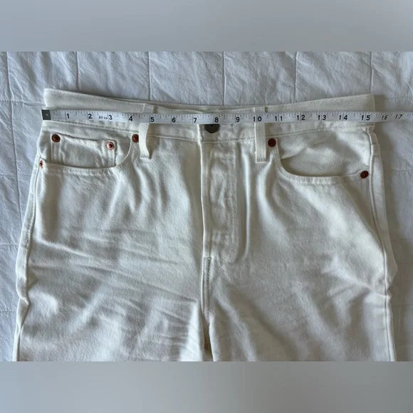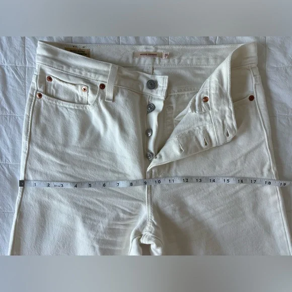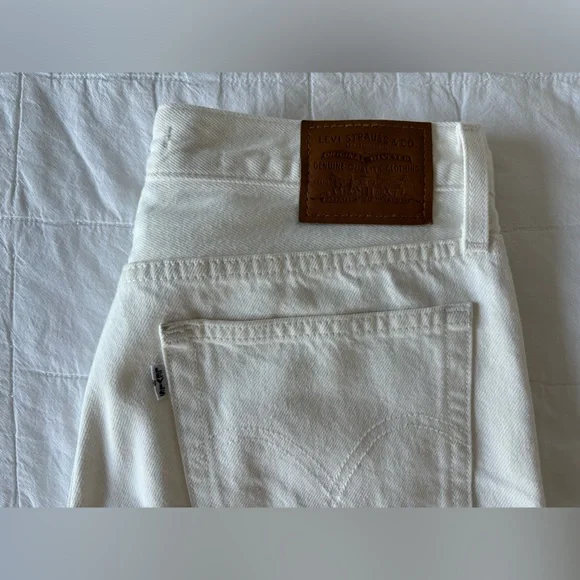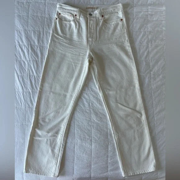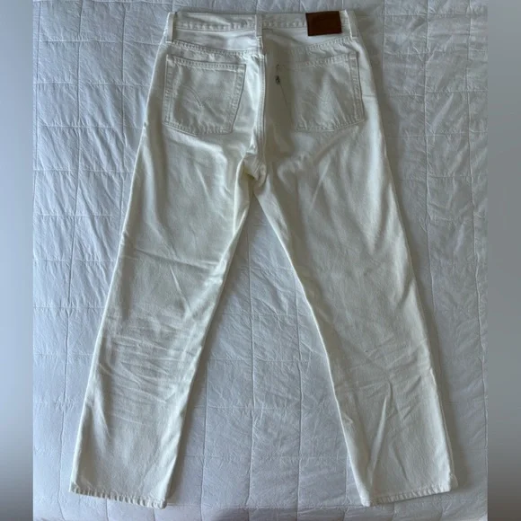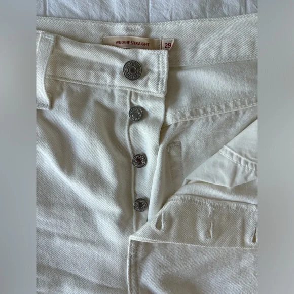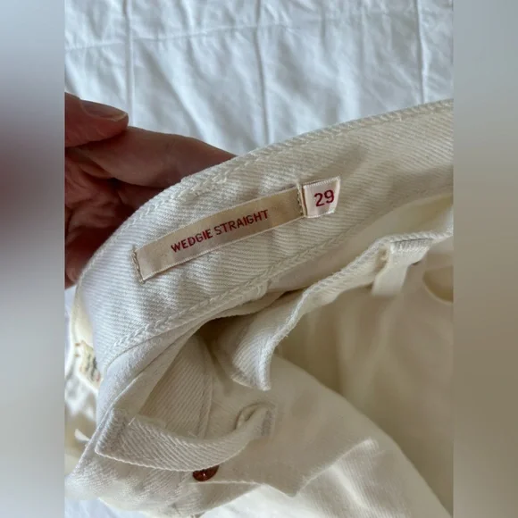 Levi’sWedgie Straight fit jeans“In The Clouds” wash: a perfect off-whiteSize 29x28Inseam is actually 27” (see photos)100% cotton, no stretchButton flyA classic staple for any wardrobe! I was very inspired by Baby’s outfit in Dirty Dancing when I bought these 😁 but they’re just too short for me. Excellent used condition, only worn a few times. Some light staining on back pockets that will probably come out in the wash (shown in photos).Questions? Ask!🌸 communicative, honest seller!🌼 quick shipping!🌸 smoke free, pet friendly home!🌼 clean garments unless otherwise noted!🌸 open to reasonable offers!