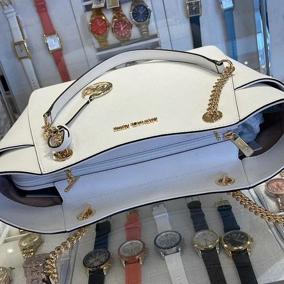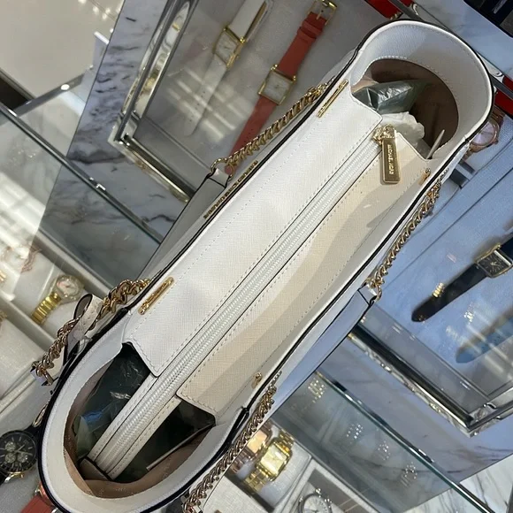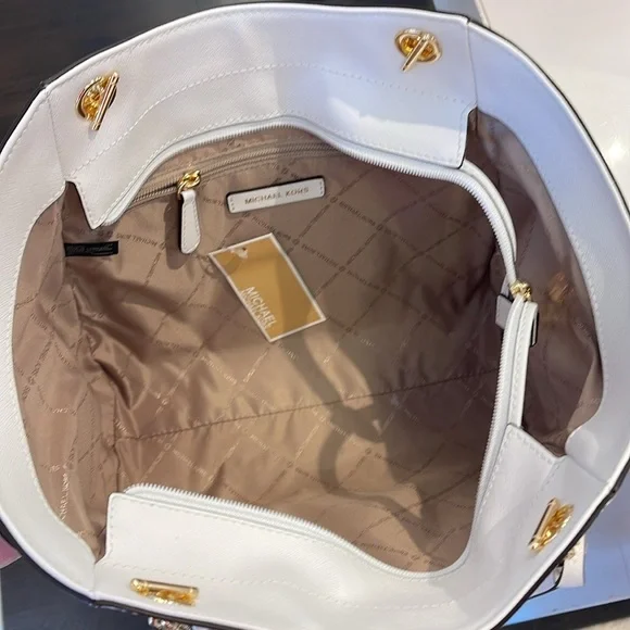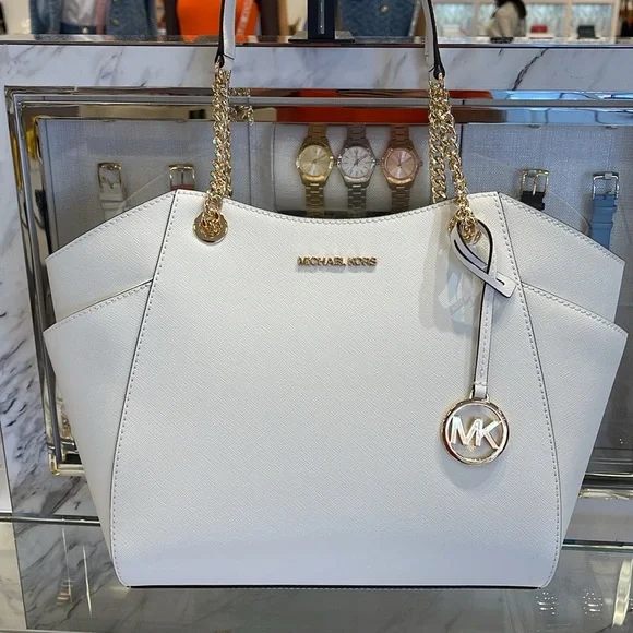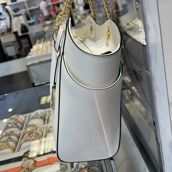 MICHAEL KORS Jet Set Travel Large Safiano Leather Chain Shoulder Tote BagOptic White NWT Authentic Ready to take you anywhere, this Jet Set shoulder bag is rendered in Safiano Leather and finished with our signature charm. The architectural shape features convenient side pockets and a secure top-zip fastening. Use it to carry all your travel essentials.• Shoulder bag• 100% leather from tanneries meeting the highest standards of environmental performance• Gold-tone hardware• 15.5"W X 9.75"H X 5.5"D• Handle drop: 10"• Exterior details: 2 side snap pockets• Interior details: back zip pocket, 2 front slip pockets• Lining: 100% polyester• Zip fastening• Dust bag not included• ImportedMICHAEL KORSJET SET TRAVEL355GTVT3LOPTIC WHITELG CHAIN SHLDR TOTELEATHERS719-0002