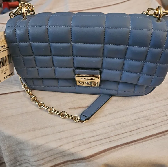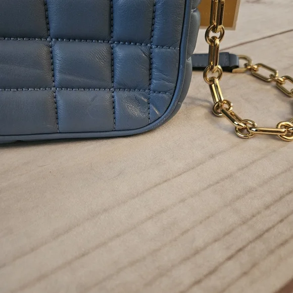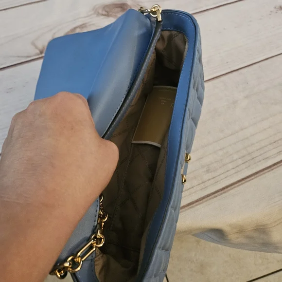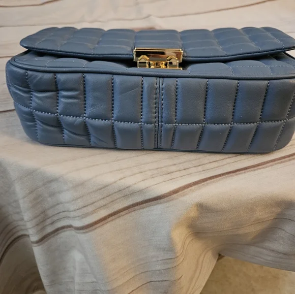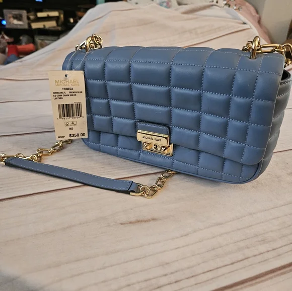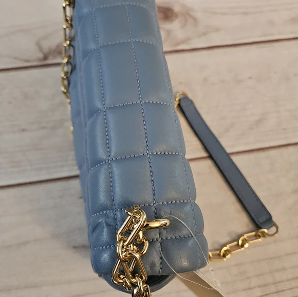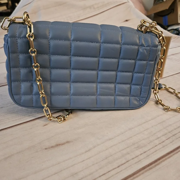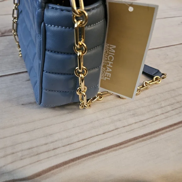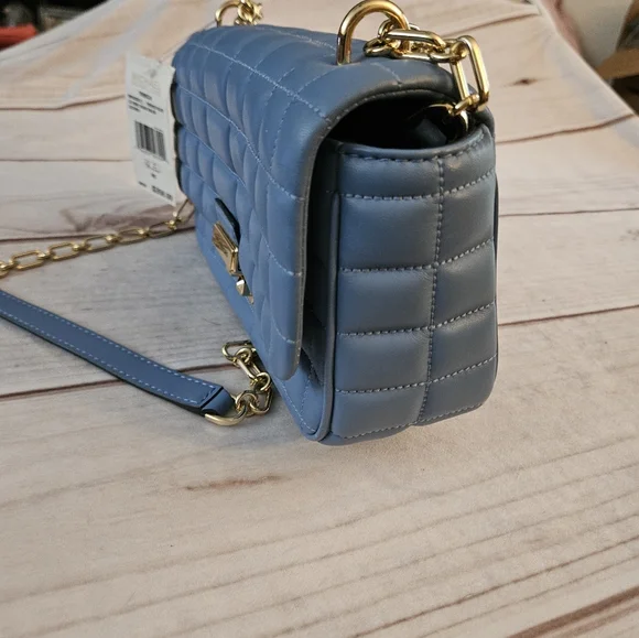 Quilted leather is accented with a bold logo plaque, defining this accessory by MICHAEL Michael Kors that can be worn as a shoulder bag or crossbody with the convertible strap.Product FeaturesSmall sized bag; 10"W x 5-1/2"H x 3"D (width is measured across the bottom of handbag)Silhouette is based off 5'9" model11-1/2"L - 20-1/2"L convertible chain strapMagnetic closureHardware tone varies by color, metal logo plaque; interior slip pocketManufacturer's 1-year limited warrantyLeather; lining: polyesterSpot cleanFrench Blue• some Pointed out "smushed" Leather parts being in bucket with other bagsSOLD OUT COLOR