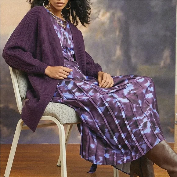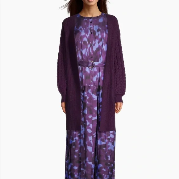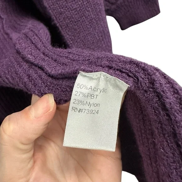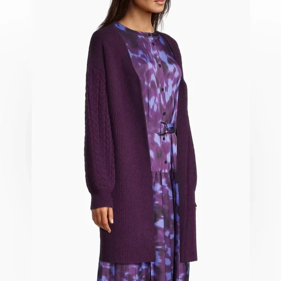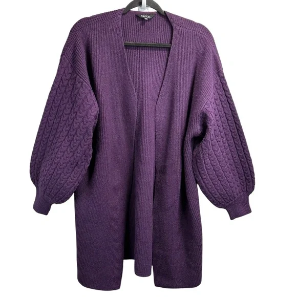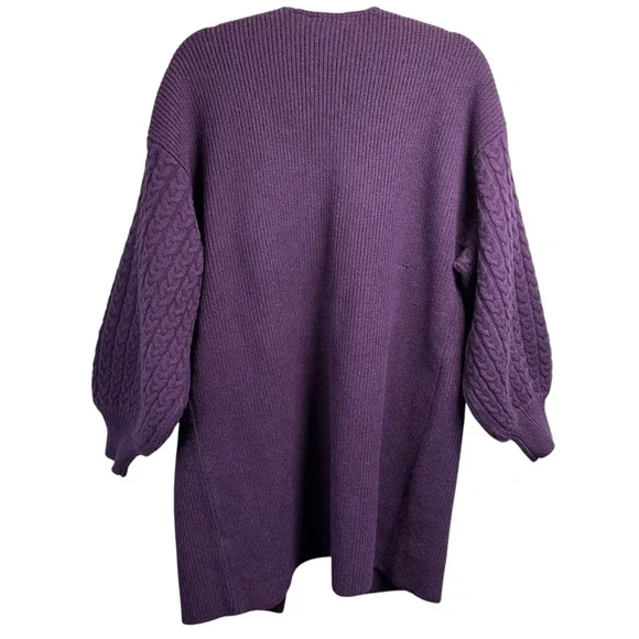 Misook Rib-Knit Balloon-Sleeve Cardigan SweaterCondition: great condition *small pull on back, not super noticeable (last picture)Color: Ultra Violet Size: smallProduct Details (from website):This Misook cardigan features an open front, cable-knit balloon sleeves, and rib-knit trim.Open frontLong balloon sleeves, rib-knit cuffsStraight hemPulls on50% acrylic/27% pbt/23% nylonMachine washFit and Sizing Details (all measurements are approximate and taken laying flat):-Pit to Pit: 22”-Length (top of shoulder to bottom hem): 34”-Sleeve Length (pit to end of sleeve): 17”Please note: This brand fits slightly larger. Consider ordering a size down.