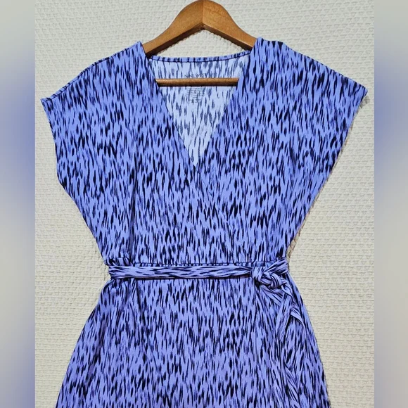 Embrace effortless style with this Nine West dress, showcasing a striking purple and black pattern. Designed with a wrap and tie front, it features a flattering v-neckline and cap dolman sleeves. The lightweight fabric makes it perfect for casual outings. This dress is in good condition and has minor wear.This dress is absolutely flattering, has a unique design,and is perfect for summer!Length 34 inches. Bust 19 inches lying flat P2P.This dress does have stretch to it.Designer, high-end,luxury,quality fabric,name brand, fashion designer,dress, blouse, top, creative,original, artsy, stylist, textile.material,shirt, pullover, sweater jumper, romper,fringe, belt, high-low,midcalf, midi, maxi, knee length,mini, dress, gown, frock, apparel, garb, costume, outfit, clothes, attire, silhouette, length, neckline, sleeve style,A-Line, tunic sheath, shift, baby doll. Slip dress,empire waist, peplum,wrap, fit and flare, bodycon, cocktail, wedding, formal, evening,event, prom, business casual, off shoulder,Asymmetrical, crew neck, scoop neck, V-neck, boat neck, sweetheart, square neck, and cowl neck