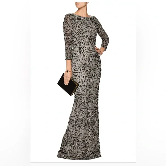 Beautiful brand new gown by Alice + Olivia. Fully beaded with a low open back, long sleeves and a little bit of a sexy trail behind,Allover embellished "Jae" gown by Alice + Olivia.Boat neckline; cutout open back.Three-quarter sleeves.Mermaid silhouette.Back zip.Polyester/nylon/viscose; polyester/spandex lining.Imported.