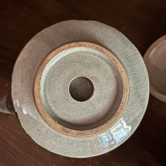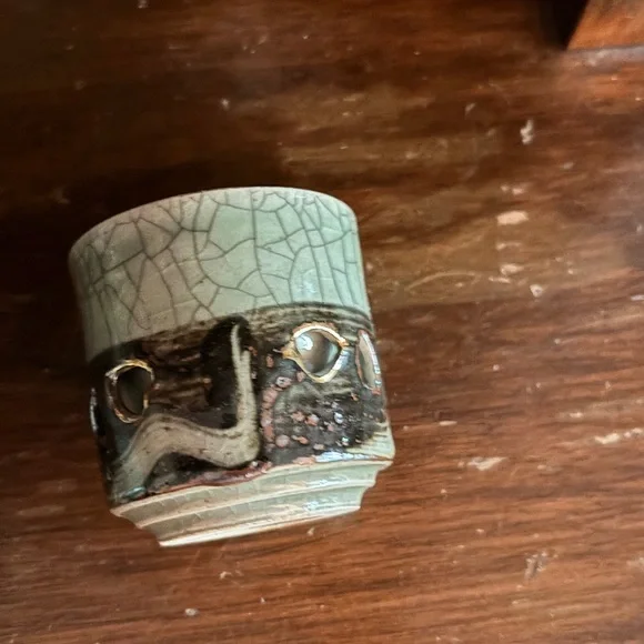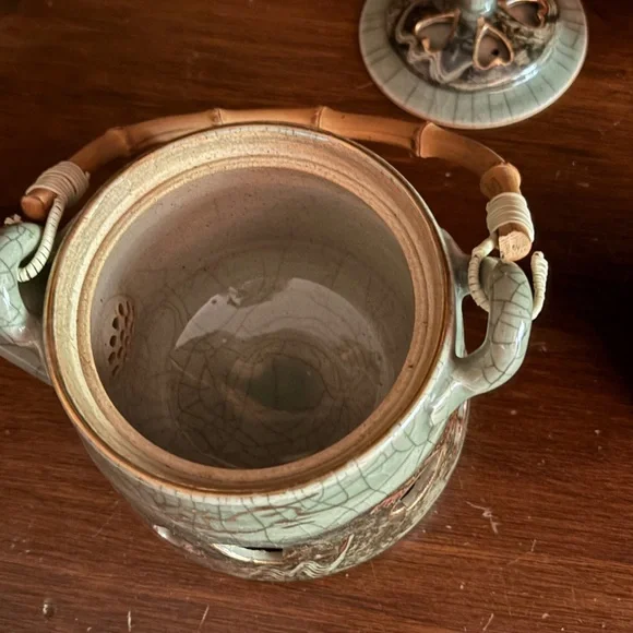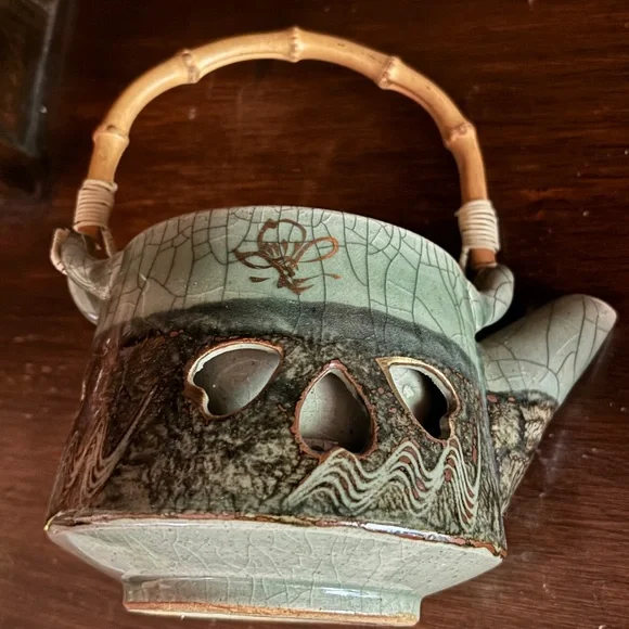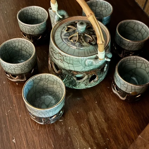Otagiri Soma Ware Somayaki Japanese tea set, vintage 1940s. Excellent condition no chips or cracks. Key features of this style include: Origin: Soma-yaki originated in Fukushima, Japan, around 1690. Crackle glaze: A distinctive "Aohibi" blue crackled glaze is characteristic of Somayaki. Double walls: Some pieces feature double walls with visible inner walls through cut-outs. Motifs: Often includes a "Hashirigoma" galloping horse design, relating to the Soma region's horse history. Craftsmanship: Handcrafted with natural glaze ingredients. Wabi-sabi: Embodies the Japanese aesthetic of wabi-sabi, appreciating beauty in imperfection and age. Materials: Made of porcelain. Set Components: This set includes a teapot with a bamboo handle and six tea cups Unique crackle glaze tea set with a teapot and matching cups. Ideal for tea enthusiasts.