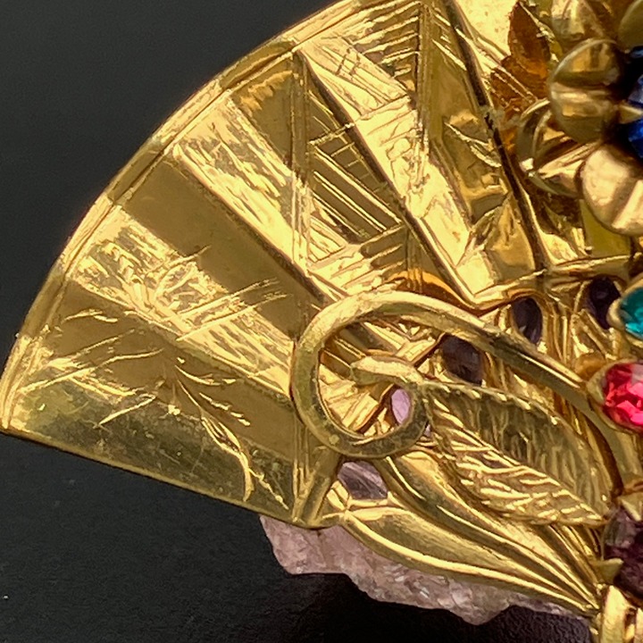 Vintage Coro Layered Rhinestone Gold Etched Fan Brooch. Signed. Detailed gold tone, crimped, etched fan layered flower motive with riveted gold leaves, flower petals with dark blue, teal, fuchsia pink and amethyst purple rhinestones. Safety catch pin back. 1 1/2" high x 2 1/2" across. Very good vintage condition. Nice gold tone.. maybe plated. Sparkling rhinestones. Shows light wear with light scratches.