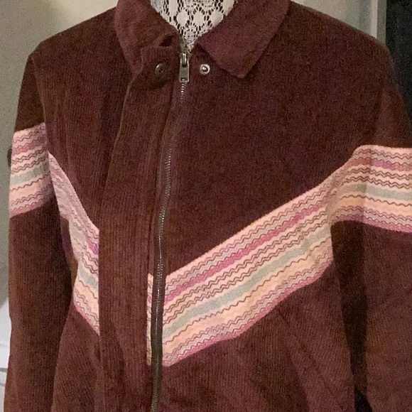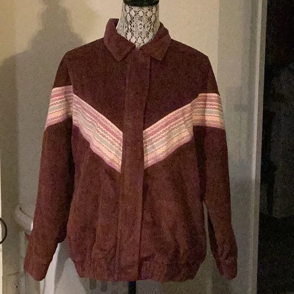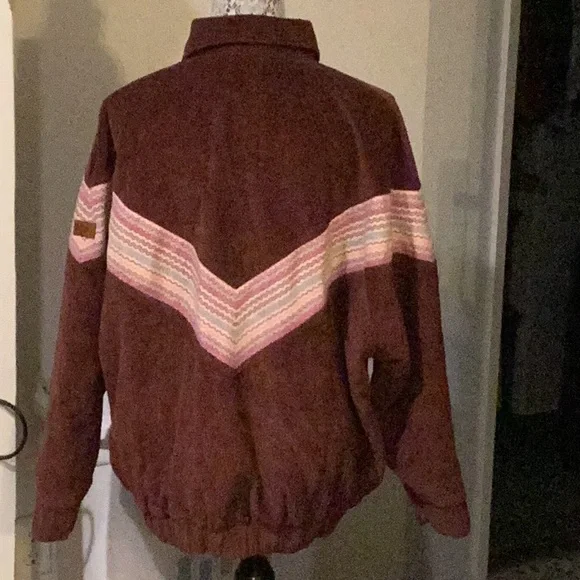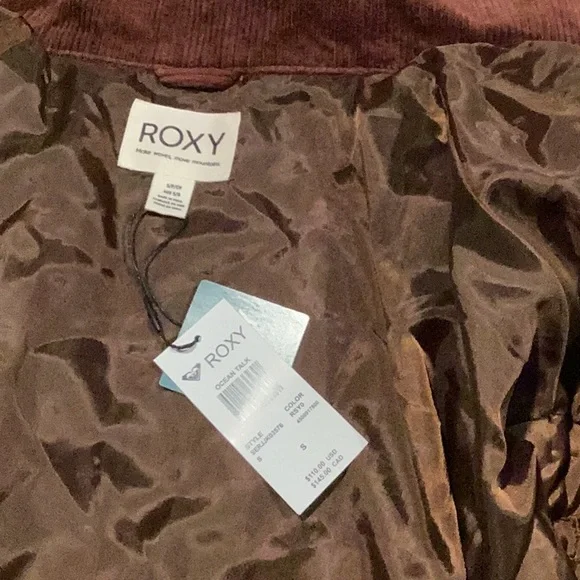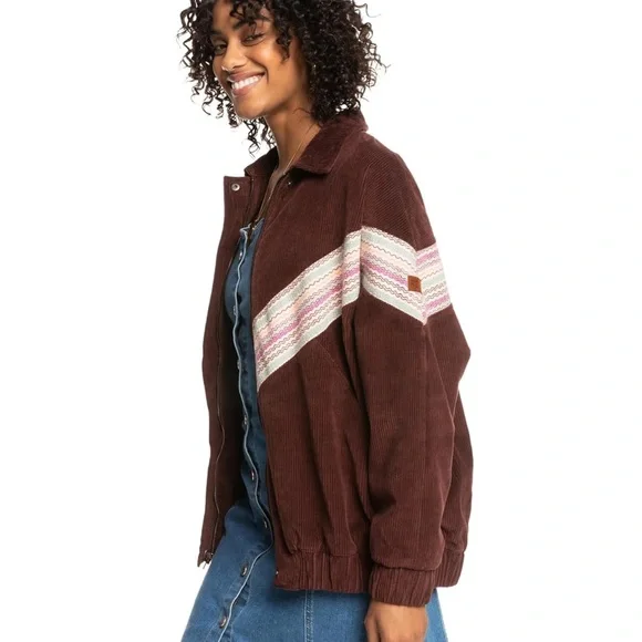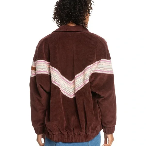 Embrace a vintage vibe with this Roxy bomber jacket, featuring a rich brown base complemented by striking pink accents. The jacket's retro design is highlighted by its soft, textured finish and classic bomber silhouette, making it a standout piece in any wardrobe.Fabric:Cotton corduroy fabric (258 g/m2).Fit:Oversized boyfriend fit.Neck:Collar neck.Sleeves:Long sleeve.Pockets:Side pockets.Closure:Full zip closure.Lining:Fully lined.Branding:Roxy suede patch.Other Features:Motif jacquard insert.Retail $110Price firm.