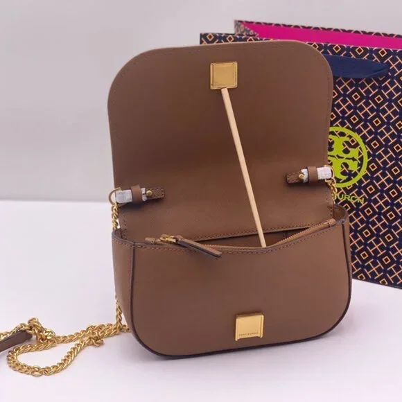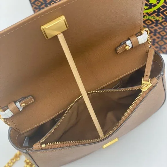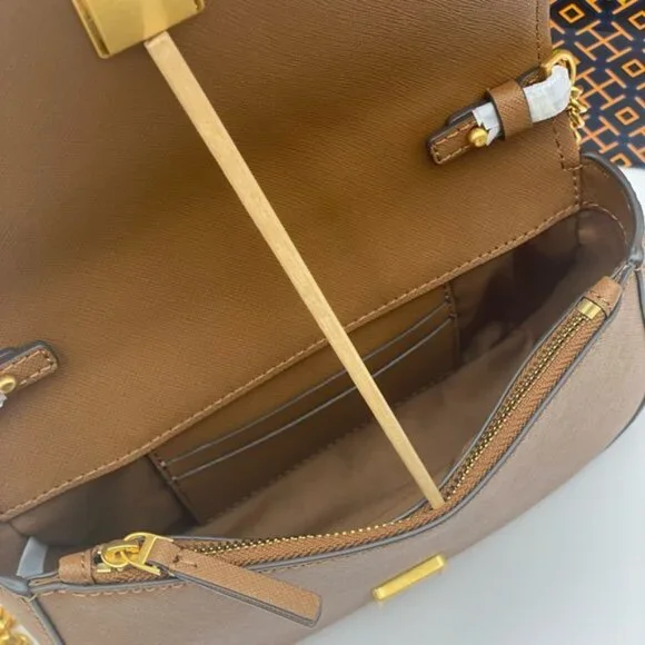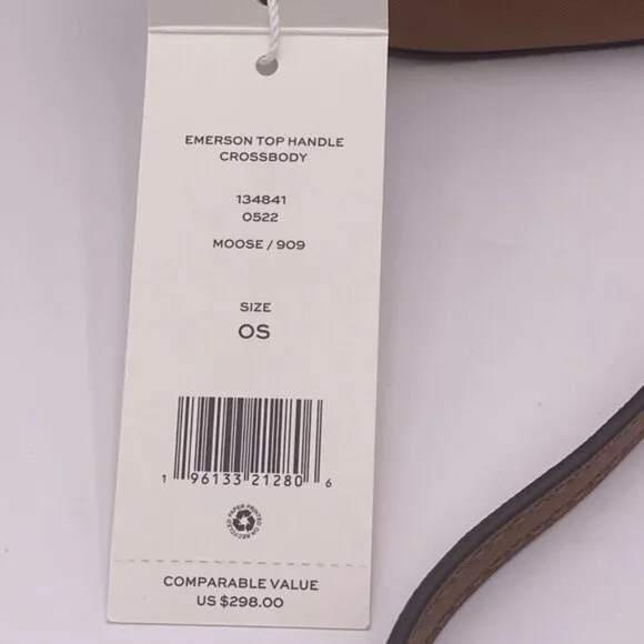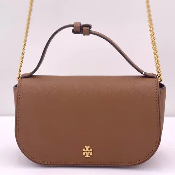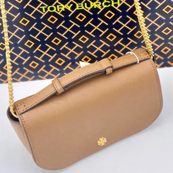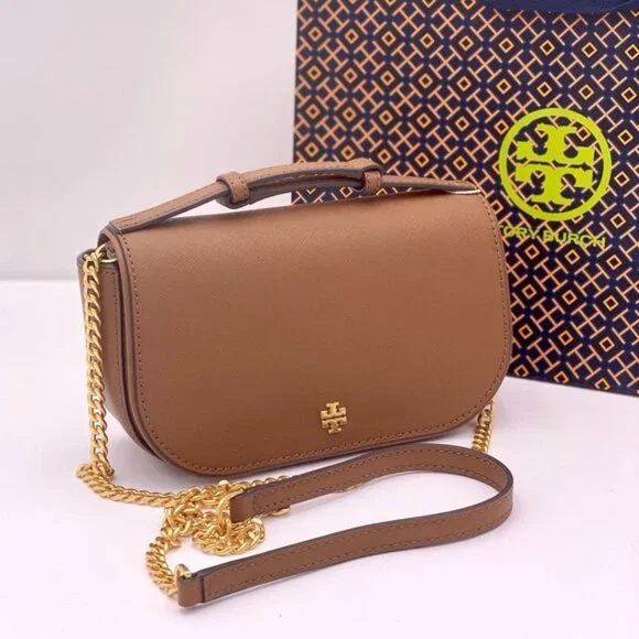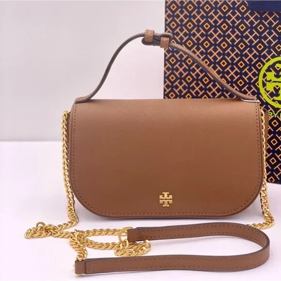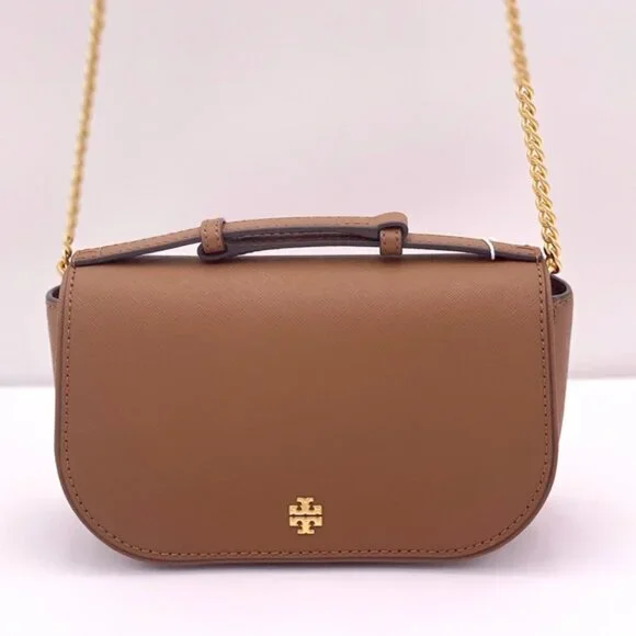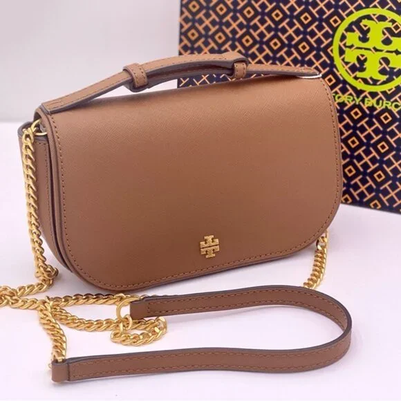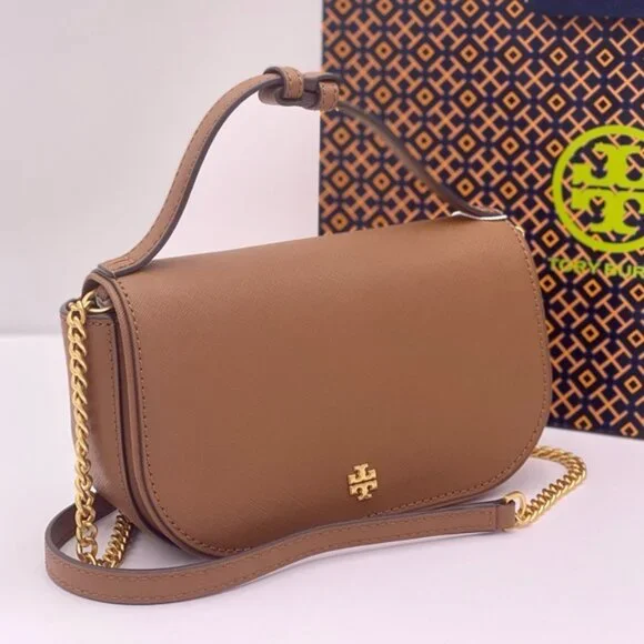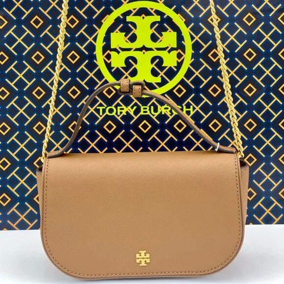 Guaranteed, authentic Tory BurchTory Burch Emerson Top Handle Bag Saffiano Leather Crossbody Bag (Moose) Gold Tone HardwareInterior Feature Tory Burch Fabric Lining, 1 Credit Card Slot, and 1 Zip PocketNon-Adjustable Crossbody Strap DropApproximately 21"Size: 8" L × 5" H × 2.25" DComes with Tory Burch gift bag