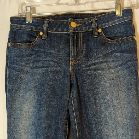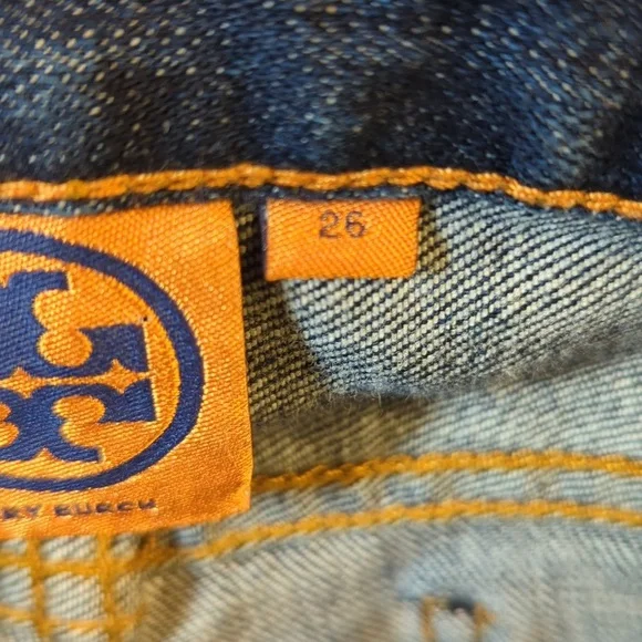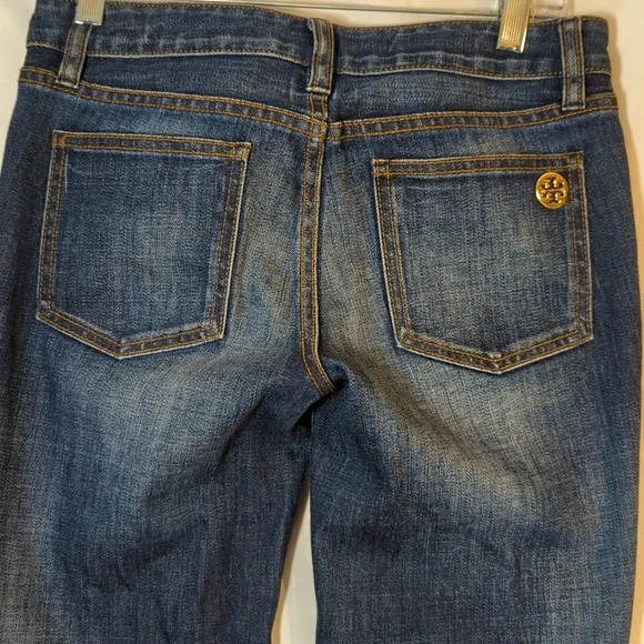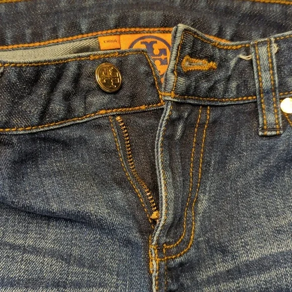 Elevate your wardrobe with these classic blue jeans. Perfect for any occasion, these jeans offer both style and comfort.Tory Burch low rise super skinny bluejeans women size 4 EU 26cotton and spandex soft denimtwo front pockets two rear pockets Double T gold toned buttonsbelt Hoopszip fly and button closureApproximate total length from waist to ankle 41.5"inseam 32"no rips or tears. all signature Tory Burch buttons still intactPlease see all pics for wear