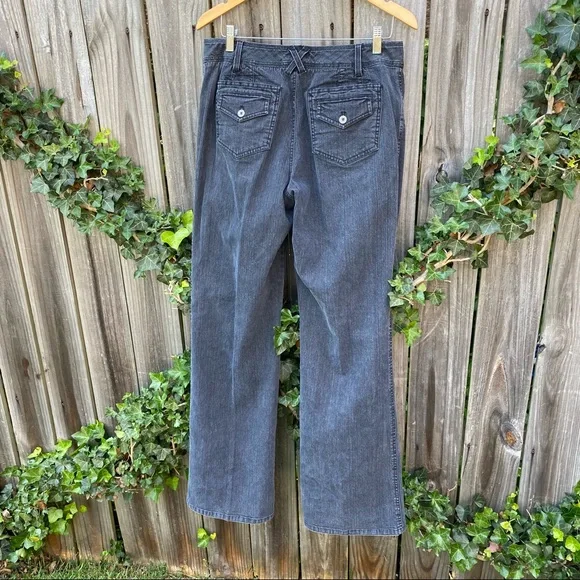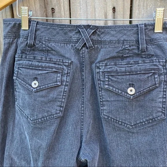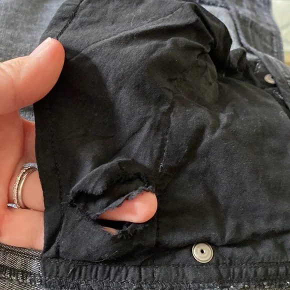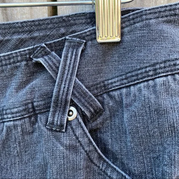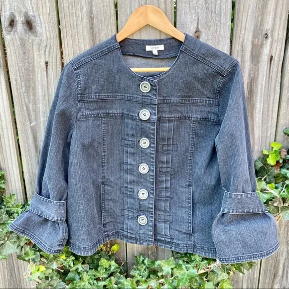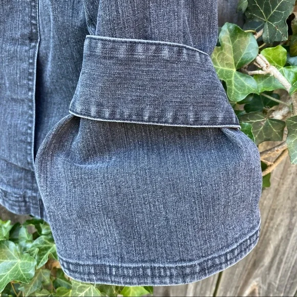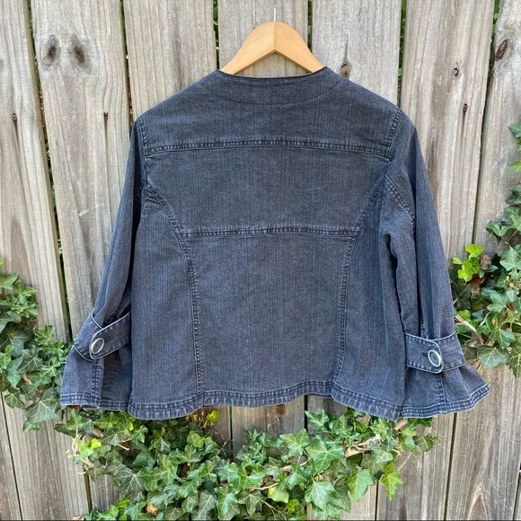 Washed black denim matched set. Collarless jacket with large logo buttons. Straps with buttons around cuffs. Long trouser-style wide leg pants. Back flap pockets with buttons. One hole inside pocket lining on pants but doesn’t affect integrity of pocket. No care tags. Seems to be 100% cotton denim. Pant measurements: waist laid flat is 16”. Rise is 9.5”. Inseam is 33”. Leg opening is 10”.
