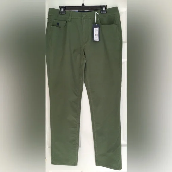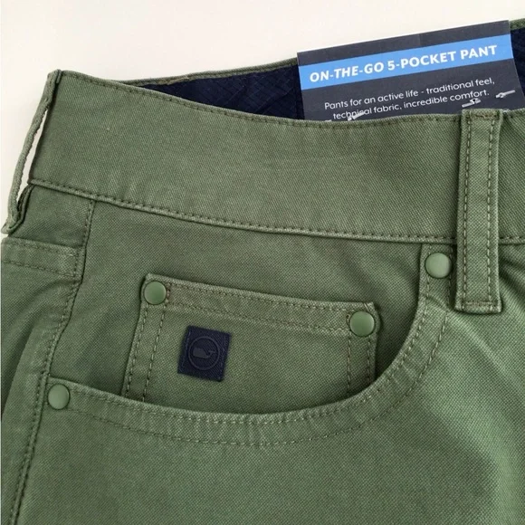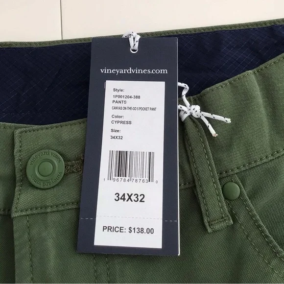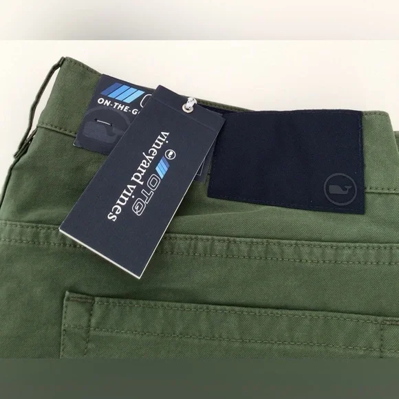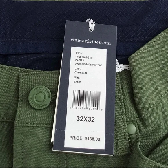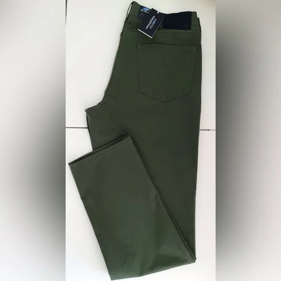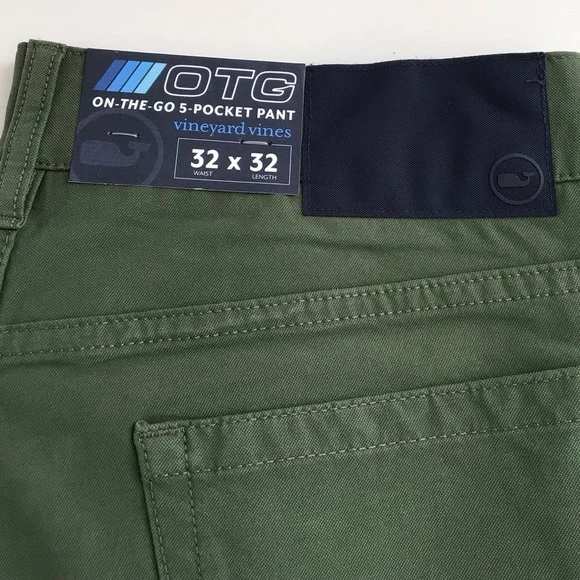 Questions? Leave a comment below!Stay comfortable and stylish with these Vineyard Vines On The Go Pants. The pants come in a beautiful cypress green color and a solid pattern. The flat front and slim leg design provide a modern and sleek look. The pants feature a zip and button closure, 5-pocket design, and a regular fit. They are made with water-repellent, moisture-wicking, and wrinkle-resistant material that is quick-drying and stretchy. These pants are perfect for any season, whether it's winter, summer, fall, or spring. Get your hands on these versatile pants from Vineyard Vines today!NWT Vineyard Vines On The Go Canvas 5 Pocket Pants.Color Cypress Green.Stretch Waistband.Belt loops Original fit through hip and thigh.Tapered slim leg from knee down 55% Cotton 32% Nylon 13% Spandex.Logo on the back and front pocket.Logo lettering on the buttons.Size 32X32.Size 34X32Leg opening 14”.New with retail tag price value $138.00