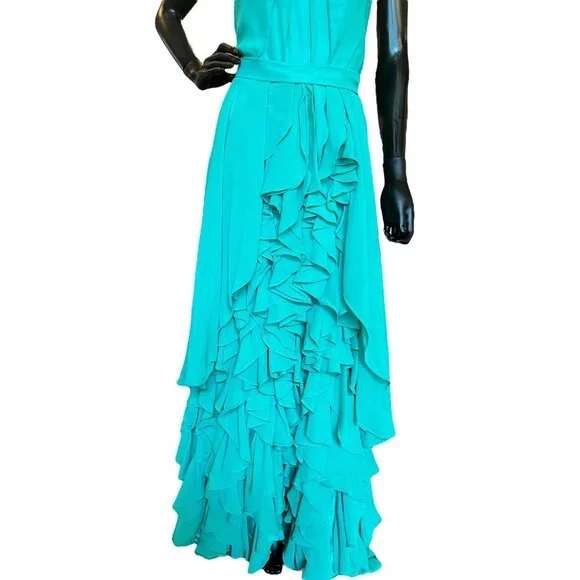 Vintage Kelly Green ChiffonThis vintage dress is lovely for multiple occasions. A tea party, garden party, or wedding is a great opportunity to show off this chic look. The bright teal compliments the fun flutters that make up the skirt while the simple neckline allows the dress to truly shine. Designer: Kelly GreenFabric Type: ChiffonSilhouette: A-lineNeckline: Strapless/SweetheartColor: TealSpecial Attributes: Fluttering tiers that fall from the hip to the ground, the bust has intricate pleatsThis item is part of our Vintage Wedding Collection. Every attempt has been made to verify it's condition but some defects may be present due to the age of the item. Please contact the seller for any questions or request for additional pictures/video prior to purchase. Thank you for shopping!