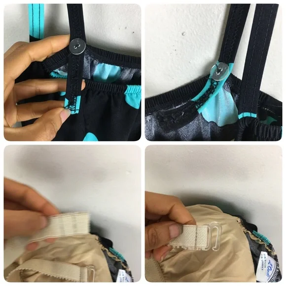 Vintage black and Aqua polka dot romper playsuit swim suit. Has 3 levels to adjust the straps. Bust lining with strap closure. Attached waist tie. No pockets. Union made in America. In preowned condition. Flaw: torn bust lining(pictured) smoke free and dog friendly. Measurements are approximate. Sorry no modeling or trades. Length:29.5"Bust:13.5" or 27"Waist:12" or 24"(elastane waist)Hips:19" or 38"Inseam:2"