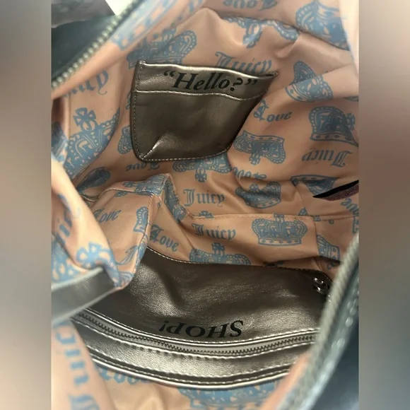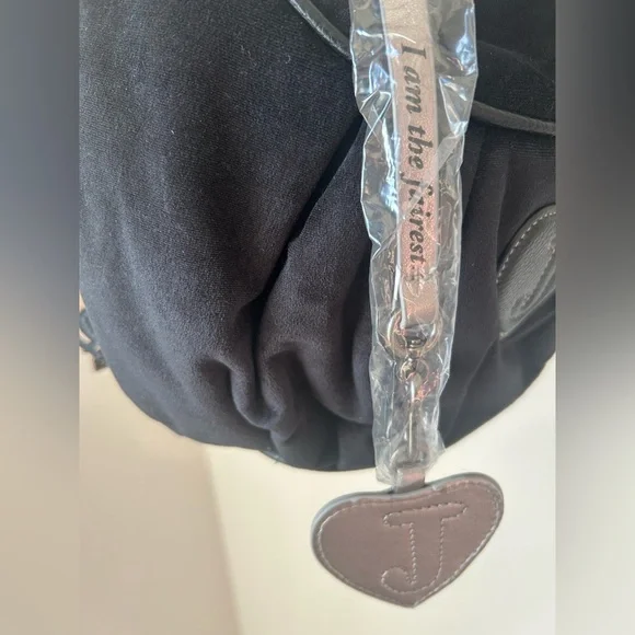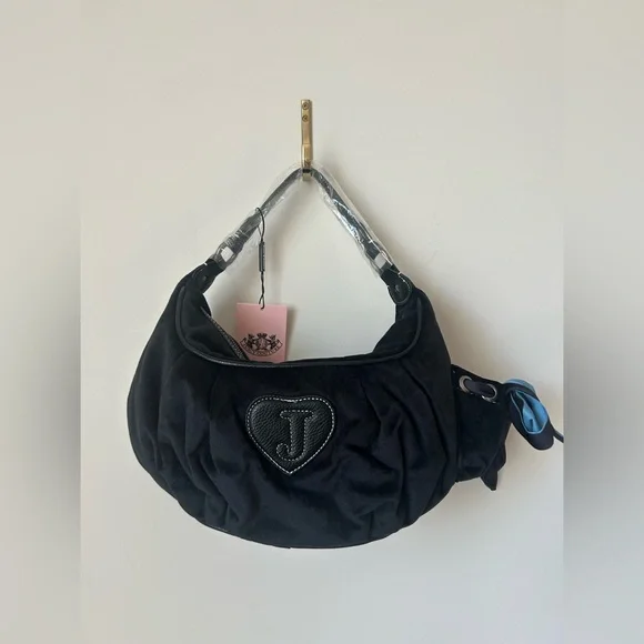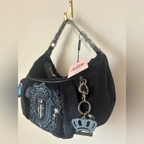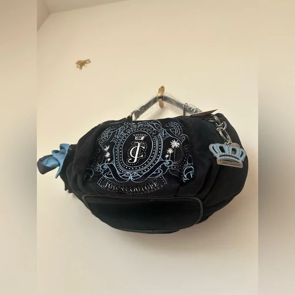 This listing is for a NWT Juicy Couture UK exclusive palm black and navy hobo bag! Absolutely stunning and was extremely hard to get! They sold out the first day the bags dropped! Straight from the beloved Y2K juicy archive, the Palm style hobo handbag has returned as the ultimate Juicy accessory. This iconic hobo bag features all the original details, including an embroidered crest to front and zipper closing. The body of the bag is made from black velour and trimmed with dark blue contrast PU. A statement ribbon detail and silver hardware, tied to a decorative bow at side. An external pocket stands at side, whilst internally pockets are functional! Also inside, a heritage branded polyester twill lining sits with kitsch slogans showcasing Juicy's fun humour.Finished with a heart PU patch to the back of the bag, a detachable crown charm hangs for an extra Juicy touch and a pocket mirror! This bag is sold out from the newest Spring 2025 drop. Bags will be shipped same or next day based on when you order- the daydreamers comes with a juicy couture official dust bag! 🩷