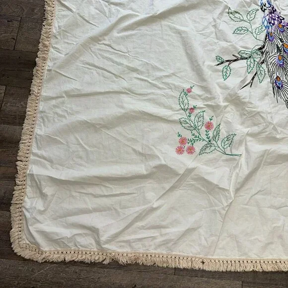 Vtg 60s Peacock Embroidered Bed Topper Fringe Coverlet White Floral 84x72Measures approximately:84*72Based on measurements found online this is APPROXIMATELY a full size blanket but please reference measurements and do you're own research for what size quilt will work best for your bedsome small spots throughout.Part of the fringe is ccoming loose on the edge as shownWeighs almost 2 lbsPlease see photos. Ask any questions before purchasing. Condition: Pre-Owned Good